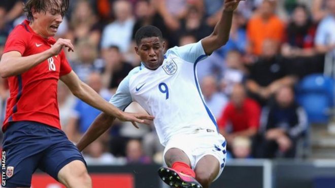 Mshambuliaji wa klabu ya Manchester United Marcus Rashford amelifungia hat-trick taifa lake katika mechi ya wachezaji wasiozidi umri wa miaka 21 dhidi ya Norway.